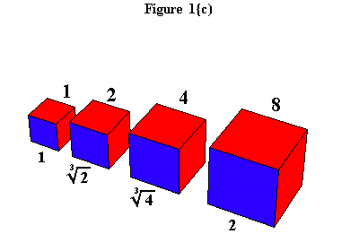 Hippocrates recognized that the arithmetic relationship is expressed by the intervals formed when lines are added, and that the geometric is expressed by the intervals when squares, or more generally, areas, are added. The formation of solid figures, being of a still higher power, did not correspond directly to any of these musical relationships. Nevertheless, the shadow cast by the doubling of the cube, expressed a relationship that corresponded to finding two geometric means between two extremes (see Figure 1c).