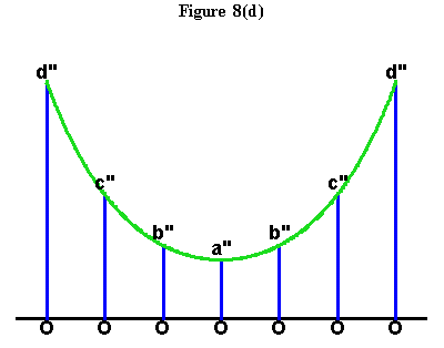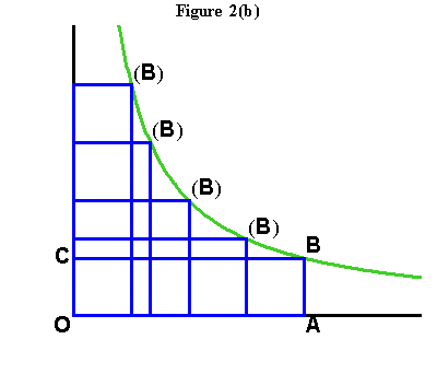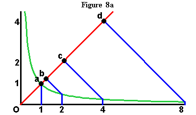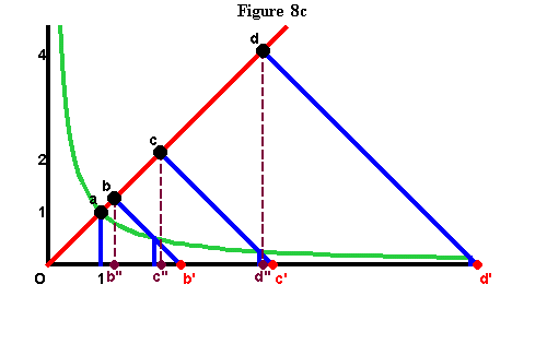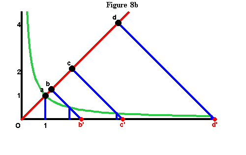 From here we are led directly into the discovery of Gauss and Riemann through Leibniz' and Bernoulli's other catenary-related discovery: The relationship of the catenary to the hyperbola(1). This relationship is formed from Huyghens' discovery. The equal hyperbolic areas define certain points along the hyperbola, that are ``projected'' onto the axis of the hyperbola, by perpendicular lines drawn from axis to those points. These projections produce lengths along the axis, that are the same lengths that, as Leibniz showed, produced the catenary! (See Figure 8a, Figure 8b, Figure 8c and Figure 8d.)