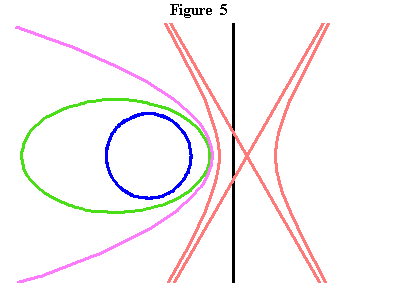 Of significance for this discussion is the discontinuity revealed by this projection between the parabola and the hyperbola. The hyperbola stands on the other side of the infinite, so to speak, from the ellipse and the circle, while the parabola has one side toward the infinite and the other toward the finite.