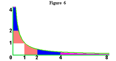 Huyghens recognized that the curved and the straight expressed themselves in the hyperbola differently than in the other conic sections. His insight was based on the same principle recognized by Menaechmus, that the hyperbola, when projected onto a plane, was formed by a series of rectangles whose area was always equal. As one of the sides of each rectangle got longer, the other side got inversely smaller. Huyghens focused his attention on the area bounded by the hyperbola and the asymptote, which is the area formed by an ever-changing rectangle whose area is always the same (Figure 6). Areas between the hyperbola and the asymptote, formed by rectangles whose sides are in proportion, are equal. Consequently, as the diagram illustrates, those sections of the hyperbola, formed as the distance along the asymptote from the center increases geometrically, are equal. Thus, as the areas increase arithmetically, the lengths along the asymptote increase geometrically. Don't miss the irony of this inversion: In the hyperbola, the (geometric) areas grow arithmetically, while the (arithmetic) lengths grow geometrically!