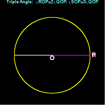 To triple a given angle POQ, mark off points R and S from Q on the circle, such that the arcs QR and RS are equal to PQ. The rays OP, OQ, OR and OS are equally spaced, so that the angle between OR and OP is {double} that between OQ and OP, and the angle between OS and OP is {triple} the original angle.