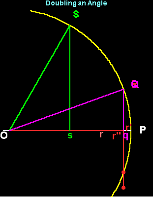 Those skillful in geometry, will find no great difficulty applying entirely analogous methods, to determine the position of the {third shadow}, s -- first in terms of r, and then in terms of q. It turns out that the distance Os is equal to 4XXX - 3X. Thus, {tripling} an angle results in {cubic} relationship among the corresponding "shadows" -- i.e. one involving the {third power} of X. Hence, by inversion, the implicit relationship between {trisecting an angle} and constructing the {cube root} of a given quantity, which is the general form of the classical problem of doubling a cube.