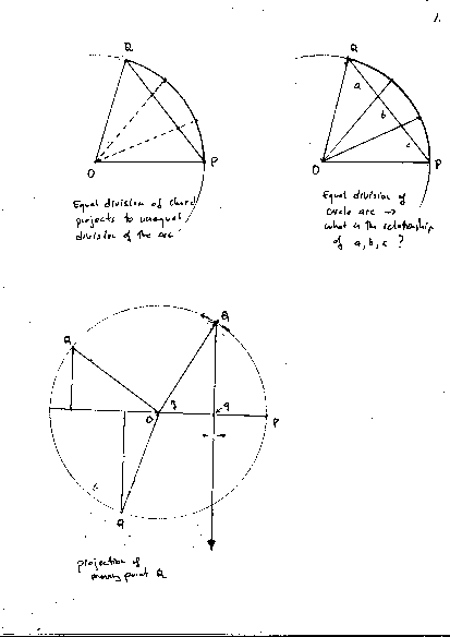 Conversely, if we project the division-points of an already trisected arc onto the chord joining the arc's endpoints (by drawing radial lines from the circle's center to the division-points on the circular arc) we get an {unequal} division of the chord (see Figure 1b). Furthermore, the lengths of the resulting segments on the chord, taken in and of themselves, do not manifest any simple proportionality; rather -- as it turns out -- the attempt to express the convoluted relationships in algebraic form, inevitably leads to what are called "equations of the third (cubic) degree".