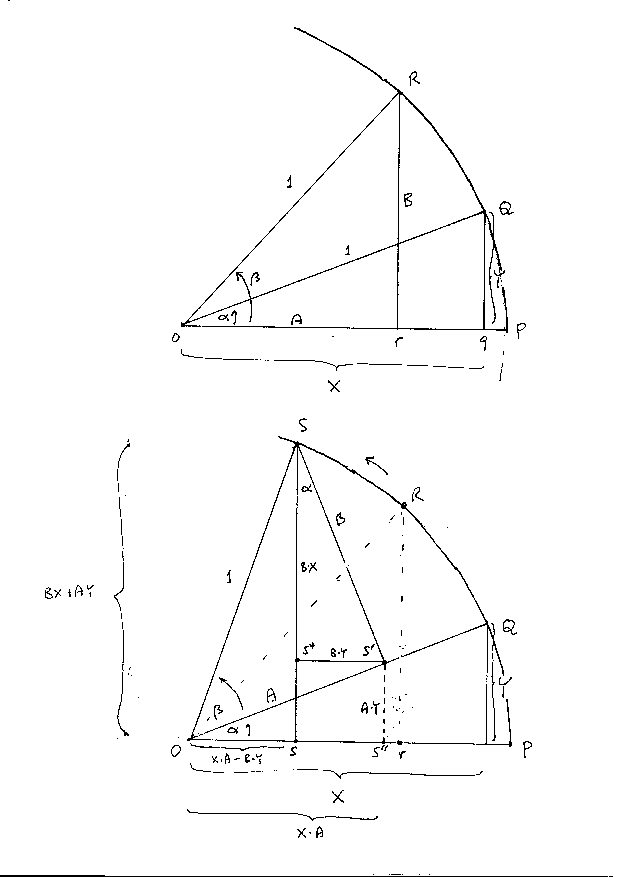 Putting these results together, we find: length of Ss = length Ss* + length s*s = {B x X} + {A x Y}. Summing up: the lengths of the horizontal and vertical sides of the right triangle, generated by the angle {alpha} + {beta}, are {X x A} - {Y x B} and {X x B} + {Y x A} respectively, where X,Y and A, B are the sides of the right triangles corresponding to {alpha} and {beta} (see Figure 7b).